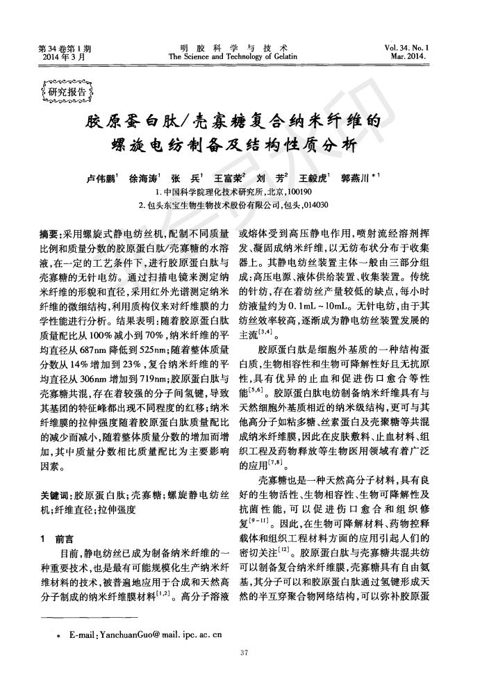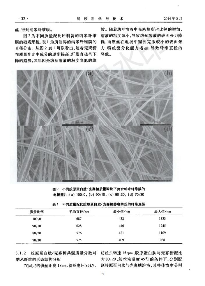 Spiral electrospinning preparation of collagen peptide/oligochitosan composite nanofibers and analys