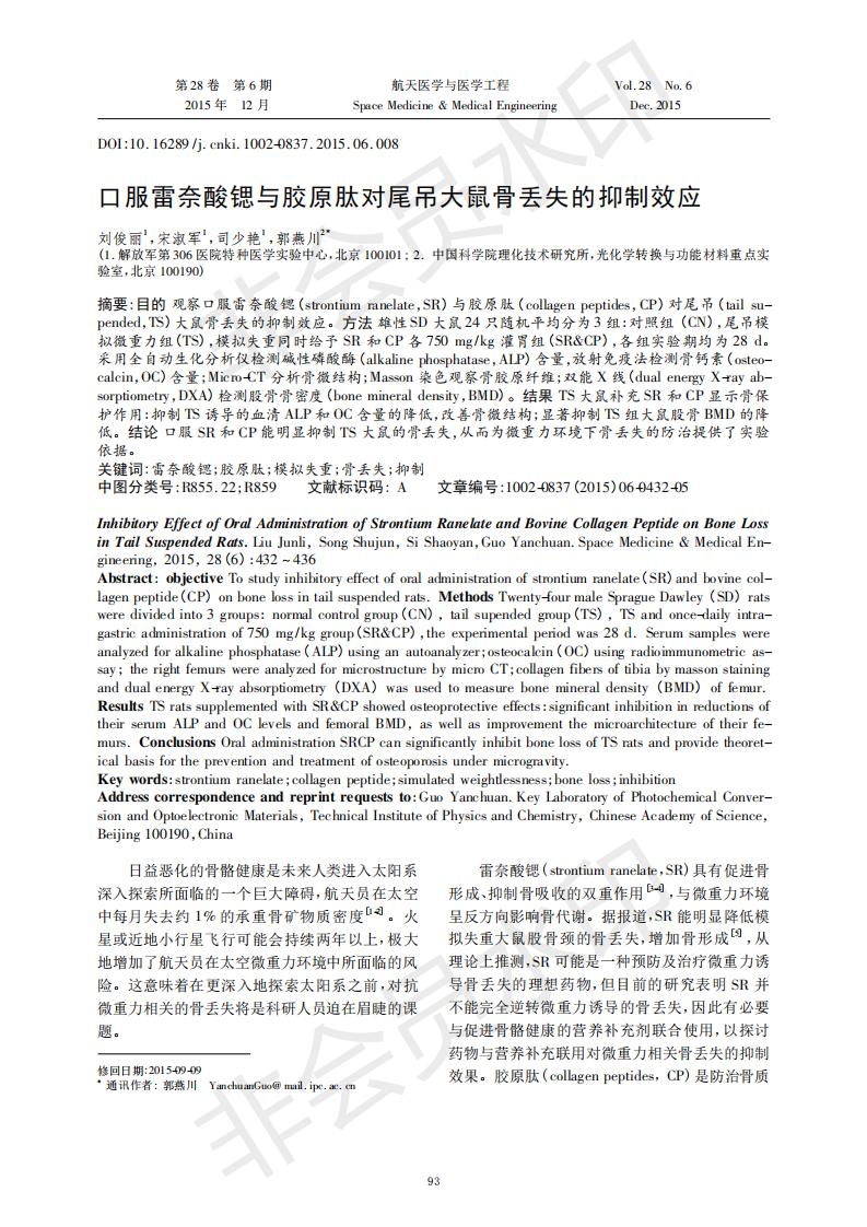 Inhibitory effect of strontium ranelate and collagen peptide on bone loss in tail suspended rats