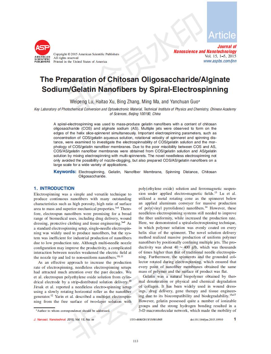 基于螺旋靜電紡絲技術(shù)的殼寡糖/海藻酸鈉/明膠納米纖維的制備研究