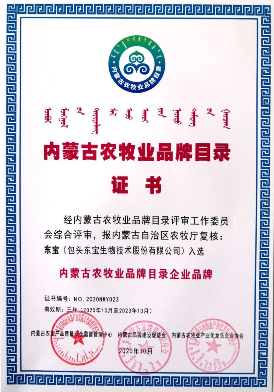 近日,內(nèi)蒙古農(nóng)牧業(yè)品牌目錄發(fā)布會(huì)在內(nèi)蒙古國際會(huì)展中心成功舉行,自治區(qū)農(nóng)牧廳和有關(guān)部門領(lǐng)導(dǎo)、組織實(shí)施單位負(fù)責(zé)人及品牌目錄企業(yè)代表近100人參加了發(fā)布會(huì)。現(xiàn)場(chǎng)發(fā)布了內(nèi)蒙古農(nóng)牧業(yè)品牌目錄名單,東寶生物的“東寶”和“圓素”成功入選,作為內(nèi)蒙古農(nóng)牧業(yè)品牌代表并頒發(fā)了證書。