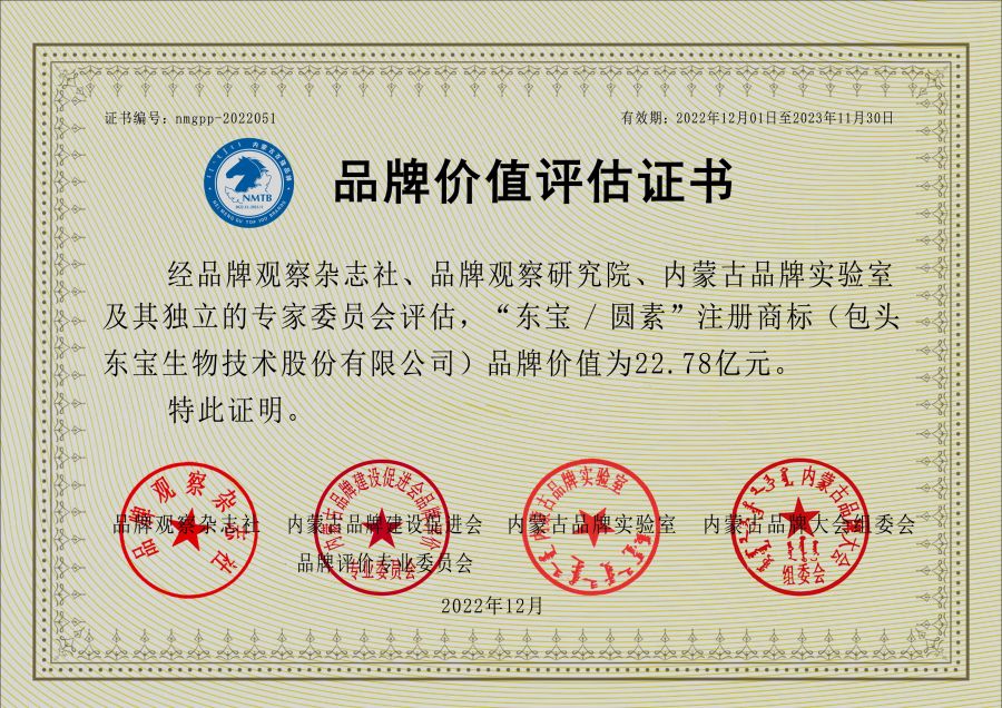 2023年1月,由內(nèi)蒙古品牌建設(shè)促進(jìn)會(huì)主辦,內(nèi)蒙古品牌大會(huì)組委會(huì)、內(nèi)蒙古品牌評(píng)價(jià)專(zhuān)業(yè)委員會(huì)、內(nèi)蒙古知名品牌認(rèn)定委員會(huì)承辦的“2022年度內(nèi)蒙古品牌價(jià)值評(píng)價(jià)信息宣介發(fā)布會(huì)”在呼和浩特隆重召開(kāi)。發(fā)布會(huì)上不僅公布了東寶生物榮獲2022年度“內(nèi)蒙古百?gòu)?qiáng)品牌企業(yè)”、“內(nèi)蒙古品牌建設(shè)標(biāo)桿企業(yè)”等稱(chēng)號(hào),還對(duì)“東寶/圓素”進(jìn)行了品牌價(jià)值評(píng)估認(rèn)證。